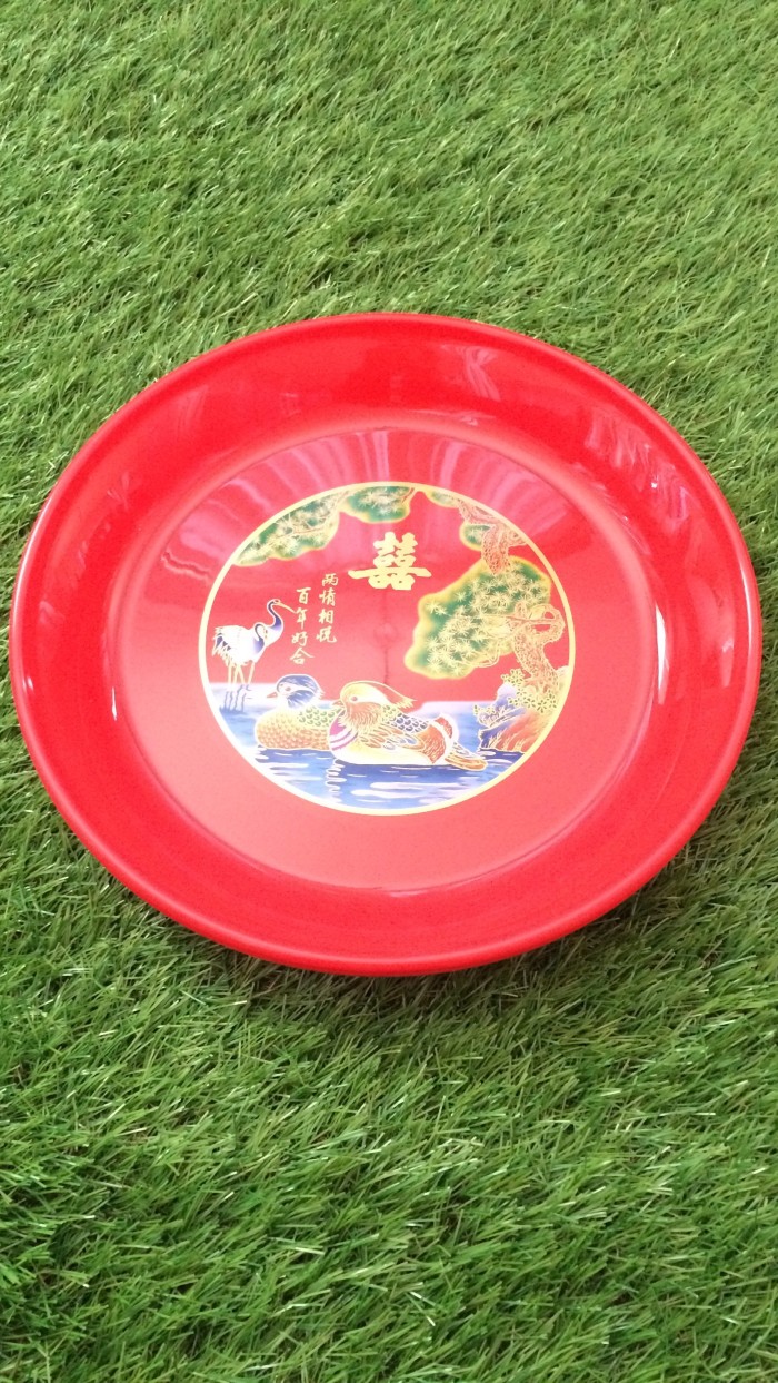 Senampan berisikan kue mangkok berwarna merah sebanyak 18 potong, sebagai lambang kelimpahan dan keberuntungan.